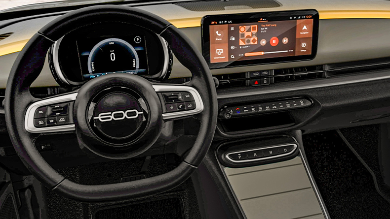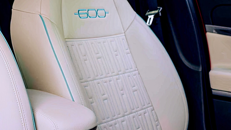 Installez-vous confortablement et profitez de son élégante sellerie soft touch couleur ivoire avec monogramme FIAT et logo 600 bleu azur.